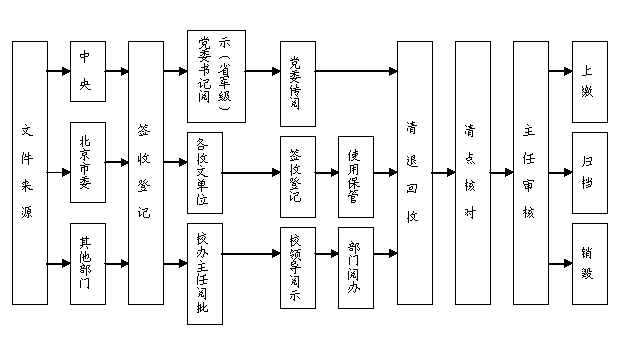 学校办公室负责上级领导部门下发的中央、市委文件和资料的收发、传阅、管理、清销工作。管理工作程序如下: